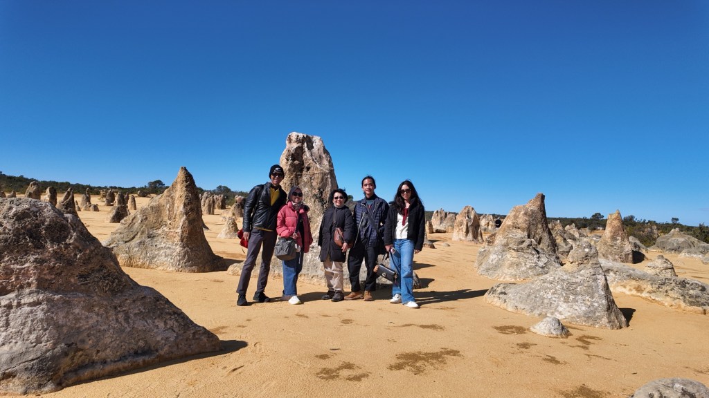 After short visit to Yanchep, we continued our journey to Pinnacles desert. Although it’s already the third time I visit this natural phenomenon, I always feel intrigued and fascinated with the unique landscape of this place. I think Aya, Rafif and Mom also felt the same. As they quickly took out their phones and capture many pictures.