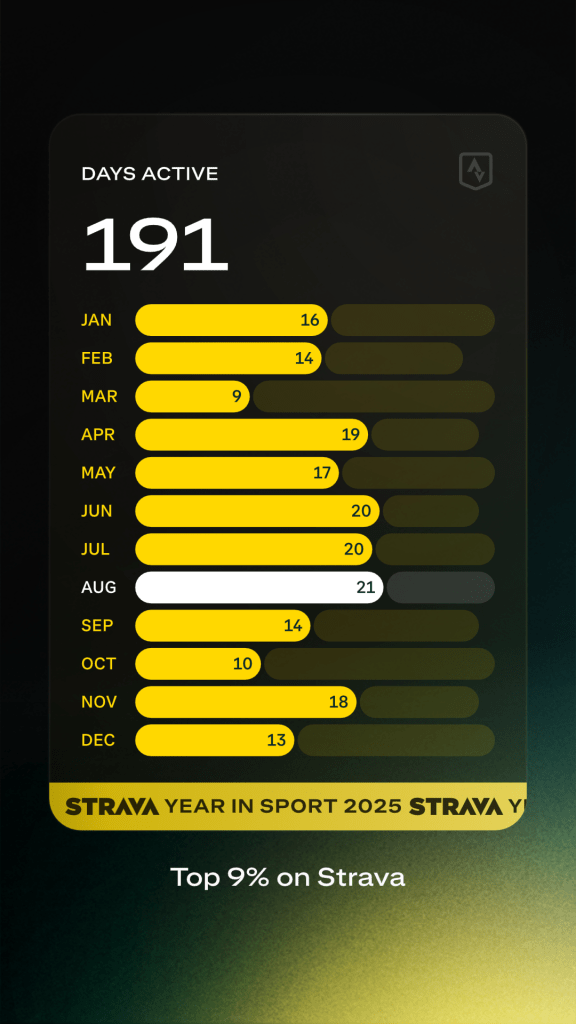 Despite of feeling to have more time for exercise, according to Strava I have less Active Days compared to 2024. It’s not much though. I have 191 days, less 3 days from 2024 (5% down). In term of distance, it even down more (9% down)