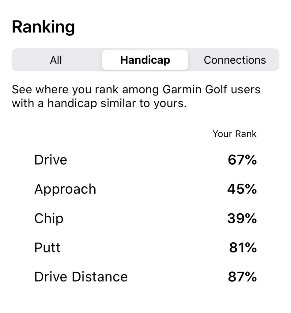 - Interesting insights came from Garmin Golf app. Compared to the players with similar Handicap, Driving is still the strength of my game. Even Driving Distance is I’m better than 87% of golfers with similar handicap. But one thing that I got to improve is on Approach and Chip, whereas I’m only better than 45% and 39% of the group. Not really a news, but it still become my areas of improvement if I want to score lower in 2026.